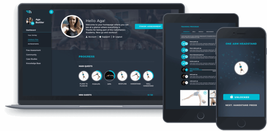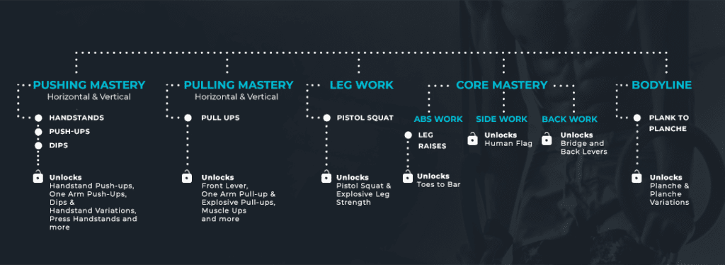 It starts with fundamentals skills to achieve like squats, pushups, pull ups, proper core work and physique and as you go along you unlock harder and harder skills.